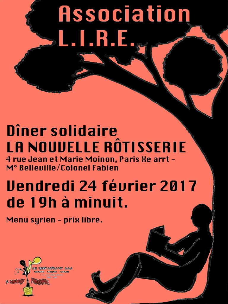 Vendredi 24 février, l’association L.I.R.E. France sera à nouveau derrière les fourneaux de la Nouvelle Rôtisserie, à Paris ! On vous propose :
